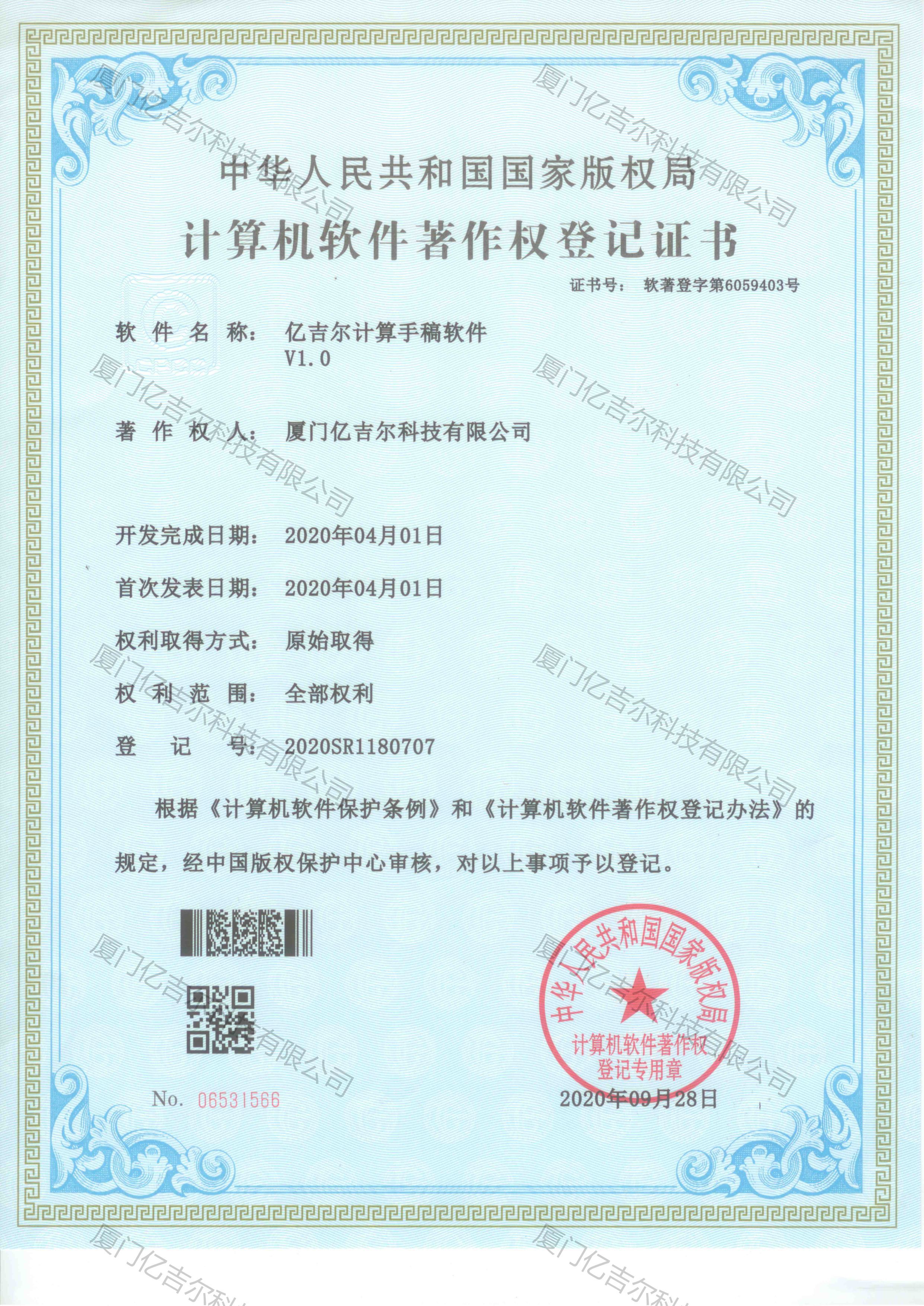 億吉爾計(jì)算手稿軟件著作權(quán)登記證書 發(fā)布日期:2020年09月28日 瀏覽次數(shù):4458 關(guān)鍵字: 公司 1/1億吉爾計(jì)算手稿軟件著作權(quán)登記證書